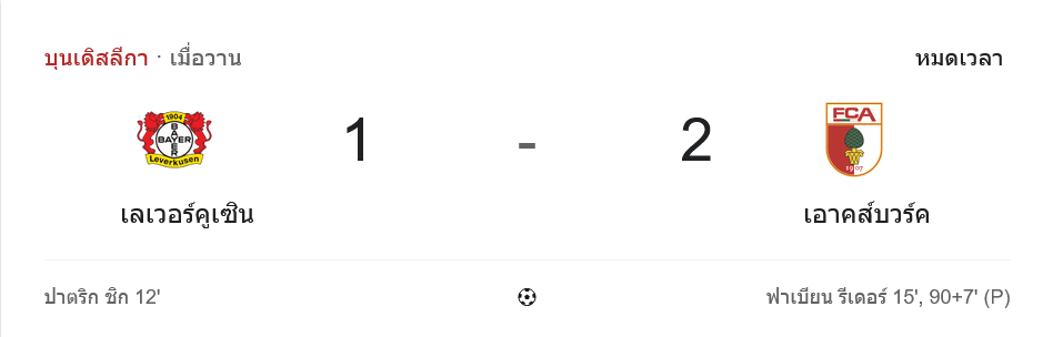 ครึ่งหลังเลเวอร์คูเซ่นยังบุกแทบข้างเดียว มีทั้ง เทลล่า กรีมัลโด้ มาซา และ ชิค ที่ได้ลุ้นหลายหน แต่จังหวะสุดท้ายไม่เฉียบพอ แถมด่านสุดท้ายของเอาก์สบวร์กเหนียวแน่นเหลือเกิน ก่อนที่ช่วงทดเจ็บทีมเยือนจะมาได้จุดโทษ และเป็น รีเดอร์ ยิงไม่พลาดนาที 90+7 พาเอาก์สบวร์กบุกชนะ 2-1 ส่งให้ บ้านผลบอล คู่นี้กลายเป็นเกมพลิกล็อกแบบเต็มตัว