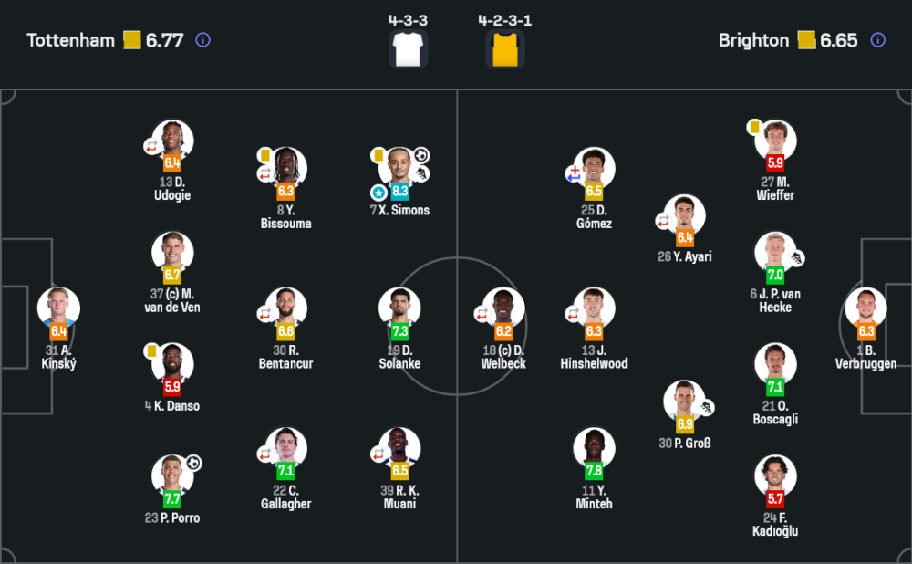 ไบรท์ตันเล่น 4-2-3-1 และคุมจังหวะได้ดีกว่าในภาพรวม พวกเขาใช้การครองบอล การสลับตำแหน่ง และการขึ้นเกมริมเส้นสร้างปัญหาให้สเปอร์สตลอด มิโตมะลงมาแล้วเปลี่ยนสมดุลเกมจริง ส่วนมินเตห์กับอายารีช่วยพาทีมทะลุผ่านแดนกลางได้หลายครั้ง