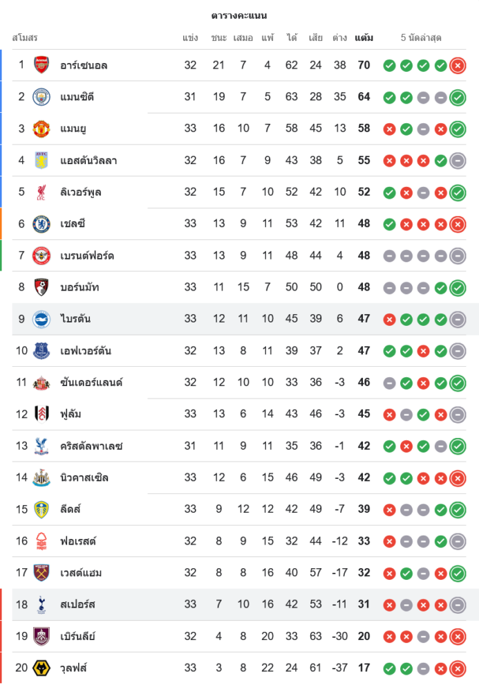 สถานการณ์ในตารางคะแนนพรีเมียร์ลีก อังกฤษ