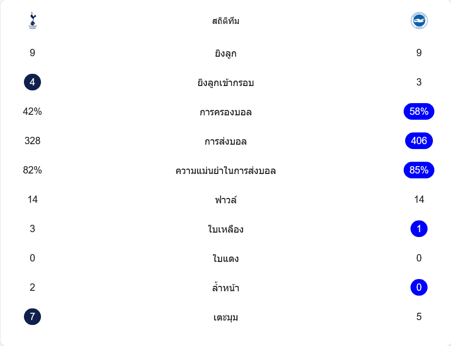 ด้านเกมปะทะถือว่าสูสี ทั้งสองทีมฟาวล์ 14 ครั้งเท่ากัน แต่สเปอร์สโดนใบเหลือง 3 ใบ มากกว่าไบรท์ตันที่โดน 1 ใบ เจ้าถิ่นได้เตะมุม 7 ครั้ง มากกว่าไบรท์ตันที่ได้ 5 ครั้ง สถิติโดยรวมสะท้อนชัดว่า สเปอร์สมีช่วงบุกหนักกว่า แต่ไบรท์ตันคุมเกมและรักษาความสม่ำเสมอได้ดีกว่าในระยะยาว