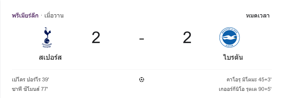 สุดท้ายสเปอร์สได้แค่แต้มเดียวในเกมที่ควรปิดให้ได้ ส่วนไบรท์ตันเก็บแต้มกลับบ้านแบบคุ้มค่าจากความอดทนทั้งเกม และแฟนบอลที่ตาม บ้านผลบอล คู่นี้คงพูดตรงกันว่า เจ้าถิ่นปล่อยชัยชนะหลุดมือเอง