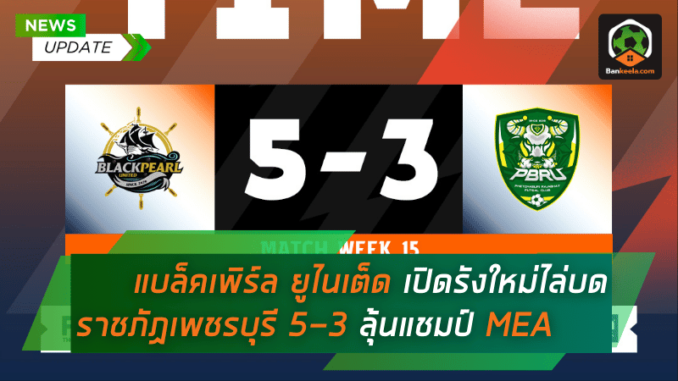 แบล็คเพิร์ล ยูไนเต็ด ประเดิมสนามใหม่อย่างงดงามที่ ไอมาเน่ เลิศนิมิตร สเตเดียม จังหวัดประจวบคีรีขันธ์ ด้วยการโชว์ฟอร์มเดือดเอาชนะ ราชภัฏเพชรบุรี 5-3 ในศึก MEA ฟุตซอลไทยลีก 2024 นัดที่ 15 เมื่อวันพุธที่ 20 พฤศจิกายน 2567 ยังคงรักษาความหวังในการลุ้นแชมป์ลีกได้อย่างเหนียวแน่น