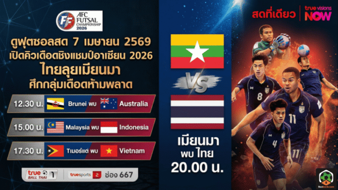 ศึก ฟุตซอลชิงแชมป์อาเซียน 2026 วันที่ 7 เมษายน 2569 มีโปรแกรมลงสนาม 4 คู่รวดตลอดวัน และคู่ที่แฟนไทยเฝ้ารอมากที่สุดคือเกมของ ทีมชาติไทย ที่จะพบกับเมียนมา เวลา 20.00 น. ซึ่งถือเป็นแมตช์สำคัญของรอบแบ่งกลุ่มที่ห้ามพลาดแม้แต่นาทีเดียว