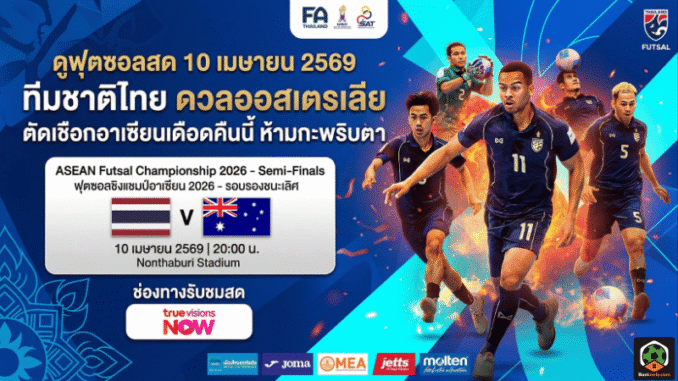 ค่ำคืนนี้แฟน ฟุตซอลทีมชาติไทย เตรียมส่งเสียงเชียร์กันให้ลั่น เพราะถึงคิวเกมสำคัญในศึก ASEAN Futsal Championship 2026 รอบรองชนะเลิศ ซึ่งไทยจะลงสนามพบกับออสเตรเลียในเวลา 20.00 น. ที่ยิมเนเซียม อบจ.นนทบุรี หรือ Nonthaburi Stadium โดยมี TrueVisions NOW รับหน้าที่ถ่ายทอดสด เกมนี้คืออีกหนึ่งบททดสอบใหญ่ของทัพโต๊ะเล็กไทยที่กำลังอยู่ในช่วงมั่นใจเต็มพิกัด หลังเดินเครื่องเก็บชัยรวดในรอบแบ่งกลุ่มและทะยานเข้ารอบมาในฐานะแชมป์กลุ่มเอ