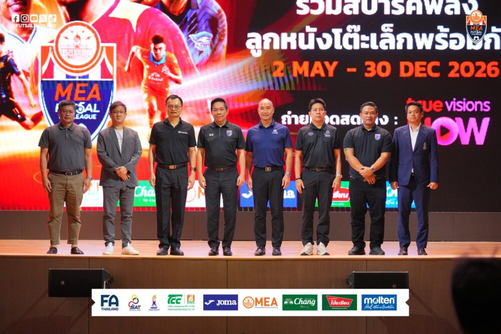 ศึก MEA ฟุตซอลไทยลีก 2026 เดินหน้าเปิดฉากอย่างเป็นทางการแล้ว หลังมีการแถลงข่าวจัดการแข่งขันอย่างคึกคักที่ห้องประชุม Auditorium ชั้น 6 อาคารวัฒนวิภาส การไฟฟ้านครหลวง สำนักงานใหญ่ เมื่อวันจันทร์ที่ 20 เมษายน 2569 โดยงานนี้มีบุคคลสำคัญในวงการเข้าร่วมพร้อมหน้า ไม่ว่าจะเป็น นายพิศณุ ตันติถาวร รองผู้ว่าการ MEA หรือการไฟฟ้านครหลวง, “บิ๊กป๋อม” นายอดิศักดิ์ เบ็ญจศิริวรรณ อุปนายกสมาคมกีฬาฟุตบอลแห่งประเทศไทย ในพระบรมราชูปถัมภ์ และ “โค้ชหมี” รักษ์พล สายเนตรงาม หัวหน้าผู้ฝึกสอนฟุตซอลทีมชาติไทย