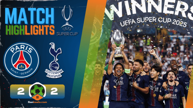 ปารีส แซงต์ แชร์กแมงแผ่พลังยักษ์ใหญ่ในเกมชิง ยูฟ่าซูเปอร์คัพ ไล่จากตาม 0–2 กลับมาเสมอ 2–2 ช่วงท้าย—คังอิน ลี ซัดนาที 85 ก่อน กอนซาโล่ รามอส แปนาที 90+4 จากบอลถวายพานของอุสมาน เดมเบเล่ แล้วปิดบัญชีในการดวลจุดโทษ 4–3 ตาม ผลบอลสด บอกชัด เกมนี้เปแอสเชคุมจังหวะอยู่หมัด แต่สเปอร์สของโธมัส แฟรงค์ก็เล่นดุดันสวนคมสุดๆ (ประตูไก่ได้จาก มิคกี้ ฟาน เดอ เวน 39’ และ คริสเตียน โรเมโร 48’) จบพร้อมภาพเดมเบเล่คว้า MOM แบบไม่ค้านสายตา