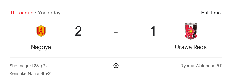 จาก : ผลบอลสด เจลีก ดิวิชัน 1 2025 ระหว่าง นาโกย่า แกรมปัส เอต 2-1 อูราวะ เรด ไดมอนส์ วันนี้ 24/5/68 – บ้านกีฬา