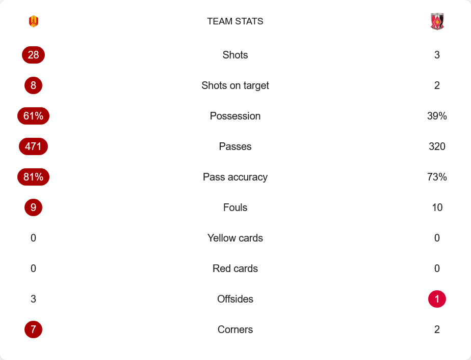นาโกย่าเป็นฝ่ายครองบอลได้มากถึง 61% ด้วยการต่อบอลแม่นยำ 471 ครั้ง ขณะที่อูราวะครองบอลได้เพียง 39% และจ่ายบอล 320 ครั้ง นาโกย่ามีโอกาสยิงถึง 28 ครั้ง เข้ากรอบ 8 หน ส่วนอูราวะยิงได้แค่ 3 ครั้ง เข้ากรอบเพียง 2 หน แม้ฟาล์วใกล้เคียงกัน แต่นาโกย่าได้เตะมุมมากถึง 7 ครั้ง ขณะที่อูราวะได้เพียง 2 ครั้งเท่านั้น ทั้งหมดสะท้อนว่าการครองเกมและจังหวะเข้าทำเป็นของนาโกย่าแทบตลอด