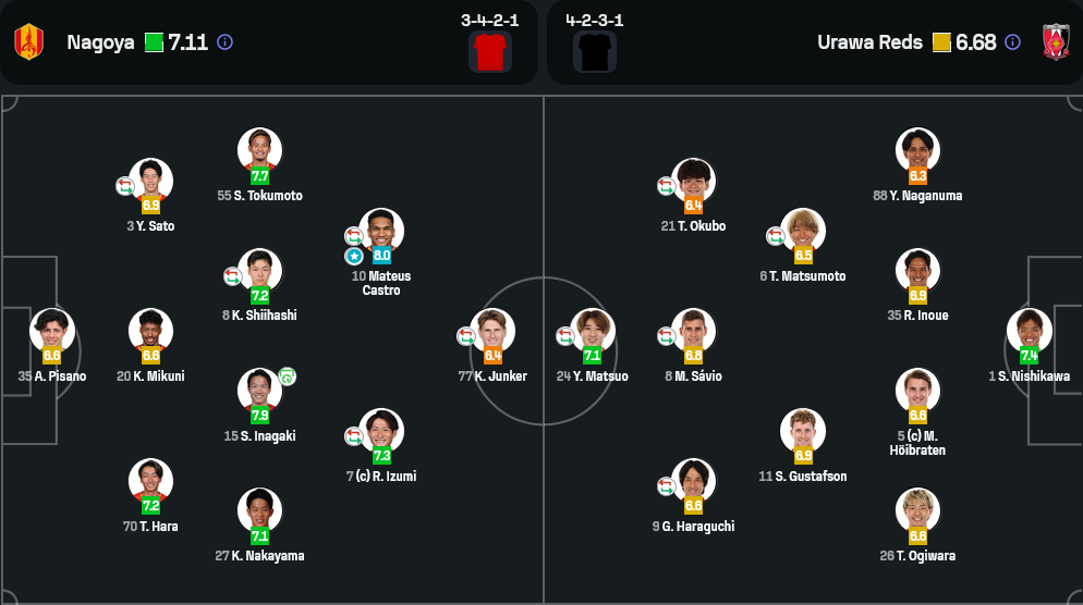 อูราวะเองเลือกใช้ 4-2-3-1 แต่การเชื่อมต่อระหว่างกลางกับหน้าไม่ไหลลื่นพอ มัตสึโมโตะและกุสตาฟสันแม้พยายามเชื่อมเกมแต่ถูกตัดเกมหลายครั้ง การสวนกลับใช้วาตานาเบะเป็นตัวจบคมแต่ขาดความหลากหลายในแนวรุก ทำให้โดยรวมแล้วแผนของนาโกย่ากลบแทบทุกจุดซึ่งชัดเจนจากรูปเกมตลอดทั้งแมตช์ บทวิเคราะห์เกมนี้จึงบอกได้เต็มปากว่านาโกย่าเหนือกว่าทั้งแท็คติกและความเด็ดขาด