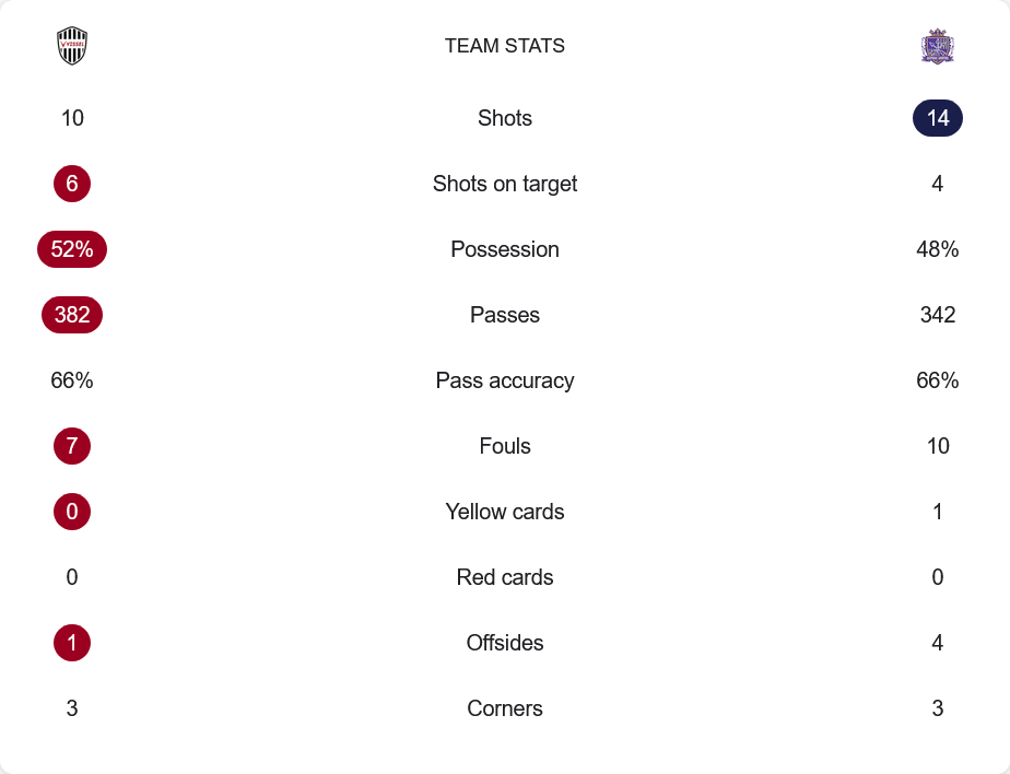 แม้ฮิโรชิม่าจะมีโอกาสยิงมากกว่า 14 ต่อ 10 ครั้ง แต่เป็นโกเบที่คมกว่า ยิงตรงกรอบถึง 6 ครั้งเทียบกับฮิโรชิม่าเพียง 4 ครั้ง การครองบอลใกล้เคียงกันที่ 52% ต่อ 48% แต่โกเบผ่านบอลมากกว่า 382 ครั้ง เทียบกับ 342 ครั้ง ความแม่นยำเท่ากันที่ 66% ฟาวล์รวมทั้งสองทีม 17 ครั้ง ใบเหลืองฝั่งฮิโรชิม่า 1 ใบ เตะมุมเท่ากันที่ 3 ครั้ง