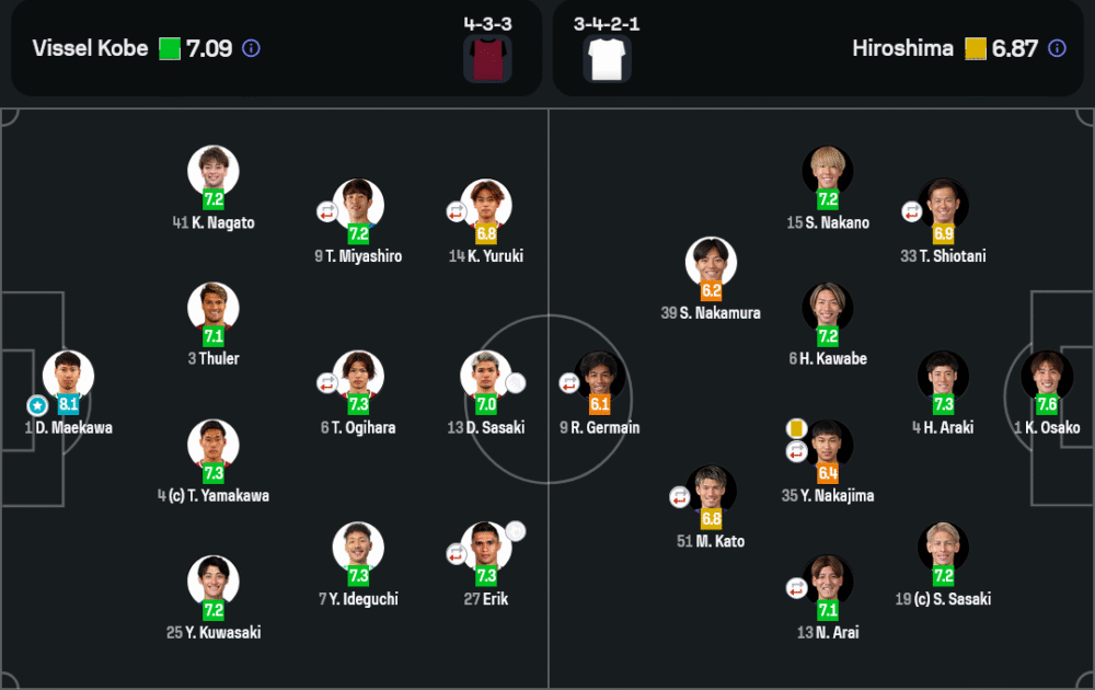 โกเบมาในแผน 4-3-3 เปิดเกมรุกเต็มสูบตามสไตล์ ครองบอลเน้นจ่ายสั้นแม่นยำและใช้ความเร็วริมเส้นบุกเข้าทำ ขณะที่ฮิโรชิม่าใช้ระบบ 3-4-2-1 เล่นแบบคอนโทรลแดนกลางและแพ็กแนวรับ 5 คนเวลาตั้งเกมรับ การ วิเคราะห์บอล ภาพรวมแล้วโกเบเหนือกว่าในจังหวะจบสกอร์และเล่นได้เป็นระบบกว่า ส่วนฮิโรชิม่าแม้จะยิงมากกว่าแต่จบไม่คมและมีข้อผิดพลาดในพื้นที่สุดท้าย