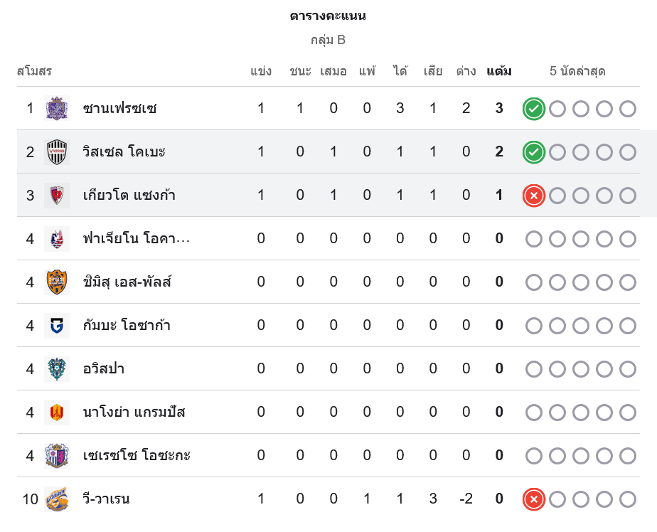 หลังจบเกมนี้ ตารางคะแนนเจลีก กลุ่ม B น่าสนใจไม่น้อย ซานเฟรชเซ เก็บชัยชนะเต็ม ๆ มี 3 คะแนนนำเป็นจ่าฝูง ขณะที่วิสเซล โกเบ แม้จะเสมอในเวลา แต่การชนะดวลจุดโทษทำให้ได้แต้มพิเศษ รวมเป็น 2 คะแนน รั้งอันดับ 2 ของกลุ่ม ส่วนเกียวโต ซังงะ ได้ 1 คะแนนจากผลเสมอในเวลา อยู่ที่ 3 ของตาราง