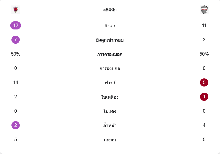 ฝั่งเกียวโตทำฟาวล์มากถึง 14 ครั้ง สะท้อนสไตล์เพรสหนักและต้องตัดเกมโต้กลับของโกเบ ส่งผลให้โดนใบเหลือง 2 ใบ ขณะที่โกเบเล่นละเอียดกว่า ฟาวล์เพียง 5 ครั้ง มีใบเหลืองแค่ใบเดียวจาก โอกิฮาระ เกมรุกทั้งสองทีมสร้างโอกาสจากลูกตั้งเตะใกล้เคียงกัน เตะมุมฝั่งละ 5 ครั้ง และมีจังหวะล้ำหน้าของโกเบมากกว่าเล็กน้อย การที่สถิติสมน้ำสมเนื้อกันขนาดนี้ยิ่งยืนยันว่า การดวลจุดโทษคือรายละเอียดเล็ก ๆ ที่ชี้ชะตาเกมอย่างแท้จริง