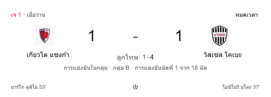 ศึกเจลีก ญี่ปุ่น กลุ่ม B เกมนี้ เกียวโต ซังงะ เปิดรังรับการมาเยือนของวิสเซล โกเบ เกมที่ว่ากันว่าเป็นหนึ่งในคู่โหดประจำกลุ่มตั้งแต่นัดแรก และก็ไม่ทำให้ผิดหวัง เมื่อทั้งสองทีมใส่กันแบบไม่มีออมแรง ตั้งแต่เสียงนกหวีดแรกจนถึงช่วงดวลจุดโทษ ปิดฉากด้วยสกอร์ในเวลา 90 นาที 1-1 ก่อนที่โกเบจะอาศัยความนิ่งเงียบกริบจากจุดโทษ ยิงเข้ารวด 4 ครั้ง ขณะที่เกียวโตพลาดถึงสอง ทำให้วิสเซล โกเบเก็บแต้มพิเศษออกจากถิ่นคู่แข่งได้สำเร็จ แฟนบอลที่ตามเช็กสกอร์ผ่านเว็บ ผลบอลสด มีได้ลุ้นกันจนหยดสุดท้ายแน่นอน