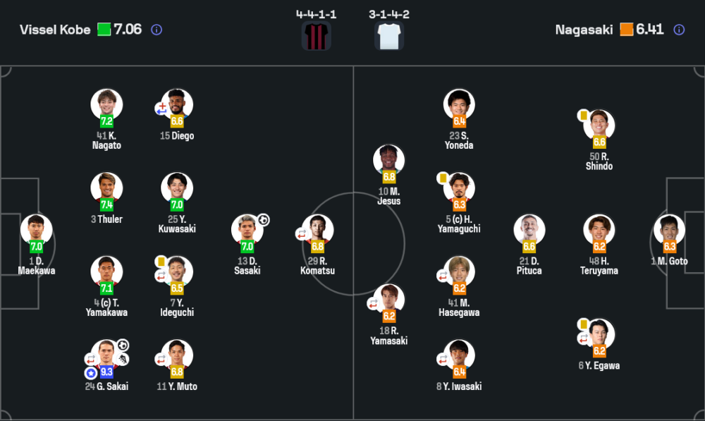 เกมรับของนางาซากิถูกโจมตีอย่างหนาแน่นจากลูกครอสและการตามซ้ำของแนวรุกโกเบ หลายจังหวะปิดมิดแต่สุดท้ายก็มาโดนลูกยิงไกลของซาไก กับลูกโหม่งระยะเผาขนของซาซากิ ซึ่งสะท้อนว่าการสกรีนหน้าเขตโทษยังหลวม ขณะที่เกมรุกแม้จะดีขึ้นหลังส่งตัวสำรองอย่าง แคมป์เบลล์ และ คาซายานางิ ลงมา แต่ก็ยังขาดความคมพอที่จะเจาะกำแพงหลังเจ้าบ้านได้