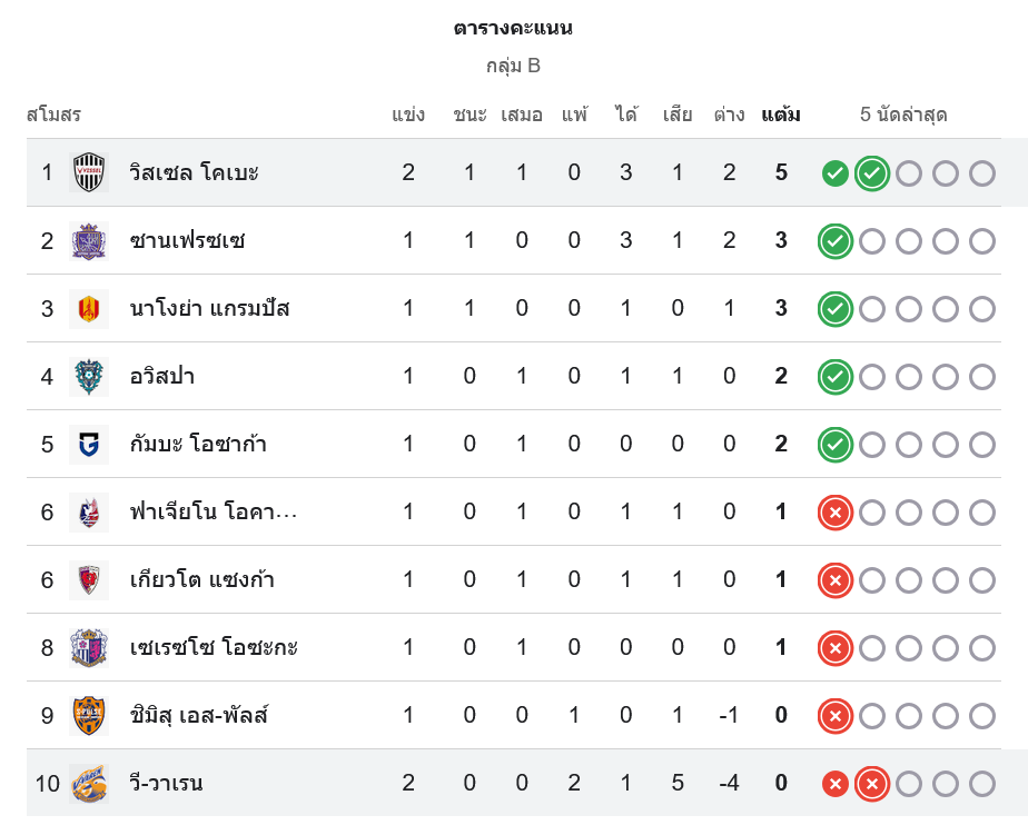 📌 สถานการณ์ในตารางคะแนนเจลีก ญี่ปุ่น กลุ่ม B