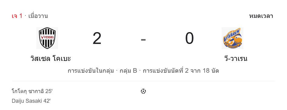 ศึก เจลีก ญี่ปุ่น กลุ่ม B เกมนี้ที่โนเอเวียร์ สเตเดี้ยม โกเบ แฟนบอลที่กดเช็ก ผลบอลสด ผ่านจอได้เห็นภาพชัดเจนว่า วิสเซล โกเบ ของกุนซือไมเคิล ชีเบ กลับสู่โหมดโหดเต็มระบบ เปิดบ้านอัด วี-วาเรน นางาซากิ 2-0 จากสองประตูในครึ่งแรกของ โกโตคุ ซาไก และ ไดจู ซาซากิ ทำให้บรรยากาศในรังเจ้าถิ่นเดือดตั้งแต่นกหวีดแรกจนจบเกม