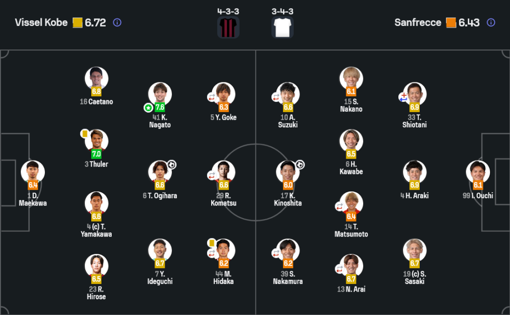 - นักเตะเด่น : ฮายาโตะ อารากิ 6.9 , สึกาสะ ชิโอตานิ 6.9 , โช ซาซากิ 6.7