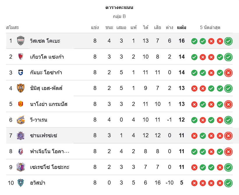 สถานการณ์ในตารางคะแนนเจลีก ญี่ปุ่น