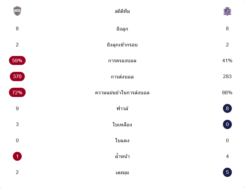 ด้านเกมรับ วิสเซลทำฟาวล์ 9 ครั้ง รับ 3 ใบเหลือง ส่วนซานเฟรซเซ่ทำ 8 ฟาวล์ ไม่มีใบเหลืองเลย ทีมเยือนล้ำหน้า 4 ครั้ง และได้เตะมุมมากกว่าที่ 5 ต่อ 2 แต่สุดท้ายความเฉียบคมในช่วงตัดสินเกมยังเป็นของเจ้าถิ่น