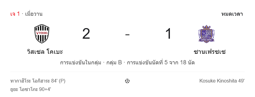- ⚽ นาที 90+4 ยูยะ โอซาโกะ ยิงประตูชัยให้วิสเซล โกเบ ชนะ 2-1