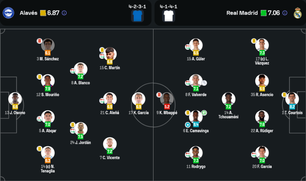 แม้อลาเบสจะพ่ายคาบ้าน แต่เกมนี้พวกเขาครองบอลได้มากกว่าที่ 56% พร้อมผ่านบอลมากถึง 503 ครั้ง และมีความแม่นยำถึง 89% ขณะที่มาดริดมีเปอร์เซ็นต์ครองบอลเพียง 44% และผ่านบอลน้อยกว่าเล็กน้อยที่ 404 ครั้ง แต่กลับมีประสิทธิภาพสูงในการโจมตีจากจังหวะสวนกลับ ทั้งสองทีมมีโอกาสยิงใกล้เคียงกัน อลาเบส 13 ครั้ง (เข้ากรอบ 6) ส่วนมาดริดยิง 11 ครั้ง (เข้ากรอบ 4) เกมนี้มีใบเหลืองถึง 8 ใบ (ทีมละ 4) และใบแดง 1 ใบจากฝั่งเจ้าบ้าน รวมถึงการฟาวล์ที่อลาเบสทำมากถึง 21 ครั้ง เทียบกับมาดริด 12 ครั้ง