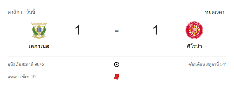 - จบครึ่งแรก: เลกาเนส 0-0 กิโรน่า แม้เจ้าบ้านจะเหลือ 10 คน แต่ยังยันสกอร์ไว้ได้