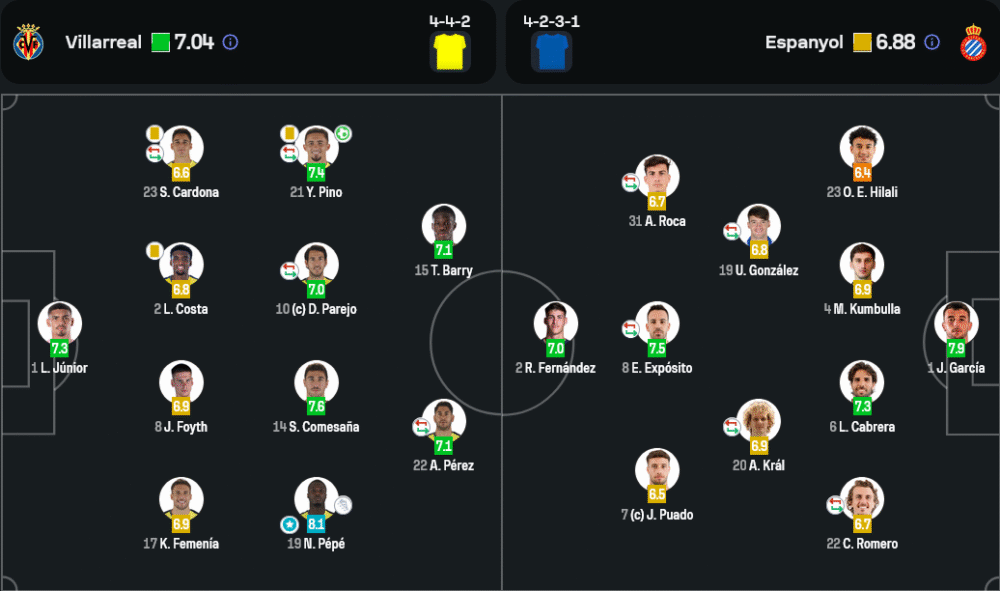 นิโกล่าส์ เปเป้ ปีกความเร็วสูงของบียาร์เรอัล คือพระเอกในเกมนี้ ด้วยคะแนน 8.1 ขับเคลื่อนเกมรุกได้อย่างโดดเด่น และทำแอสซิสต์สำคัญให้เยเรมี ปิโนยิงประตูชัย แถมยังสร้างโอกาสให้เพื่อนร่วมทีมอย่างต่อเนื่อง