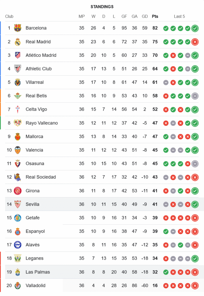 ชัยชนะเกมนี้ทำให้ เซบีย่า เก็บเพิ่มเป็น 41 คะแนนจาก 36 นัด ขยับขึ้นมารั้งอันดับ 14 และมีคะแนนเท่ากับคิโรน่า อันดับ 13 โดยยังต้องลุ้นความอยู่รอดในอีกสองเกมที่เหลือ ขณะที่ ลาส พัลมาส ยังจมอยู่ในอันดับ 19 มีเพียง 32 คะแนน และโอกาสอยู่รอดในลาลีกายังคงริบหรี่หากไม่เก็บชัยชนะในเกมถัดไป