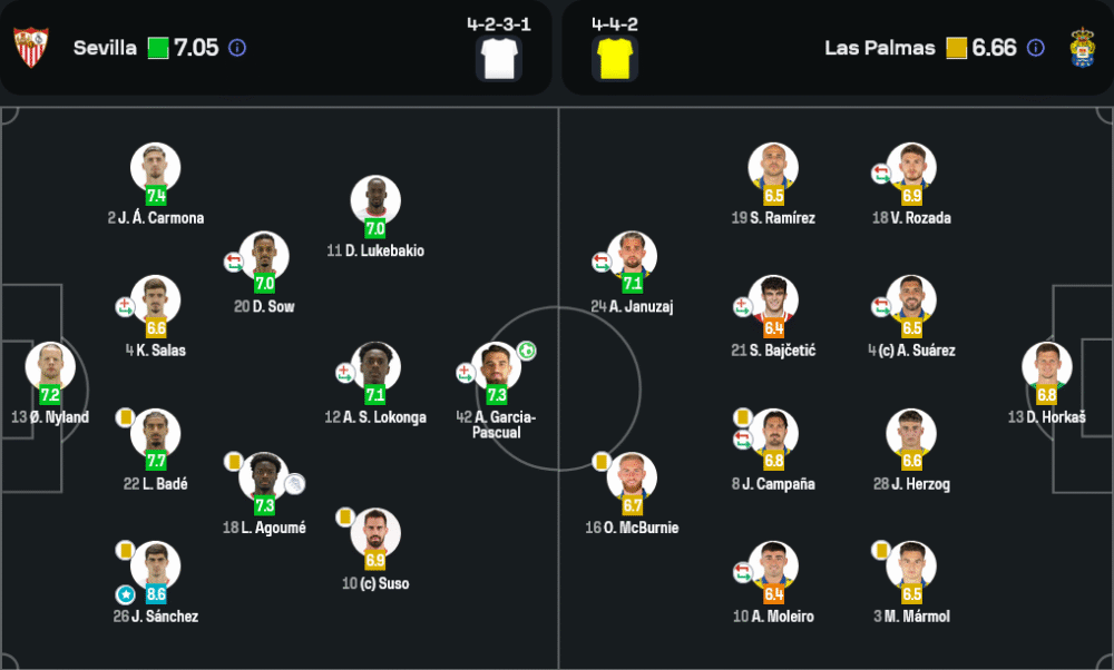 ฆวนลู ซานเชซ แนวรุกเบอร์ 26 ของเซบีย่าโชว์ฟอร์มได้โดดเด่นทั้งเกม สร้างจังหวะสำคัญหลายครั้ง ขยันเพรสซิ่ง และมีบทบาทกับการเปิดพื้นที่ให้เพื่อนร่วมทีม ได้เรตติ้งสูงถึง 8.6 ถือเป็นหัวใจสำคัญในเกมรุกของเจ้าถิ่นในค่ำคืนนี้