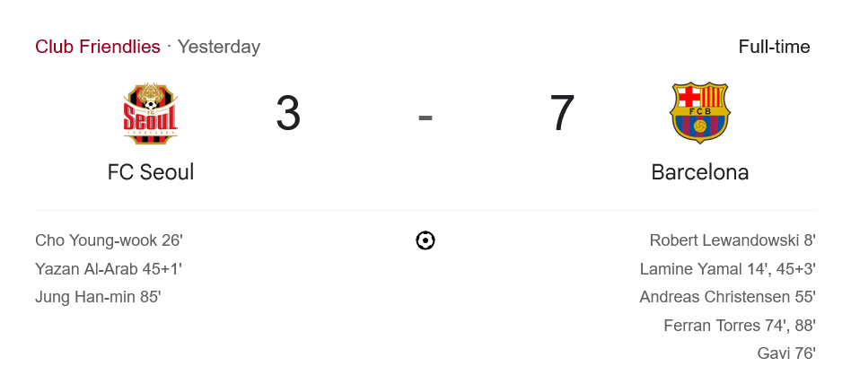 แม้เกมนี้จะเป็นแมตช์กระชับมิตร ไม่มีผลต่ออันดับในลีก แต่สำหรับ FC Seoul ที่ต้องกลับไปเล่น K League 1 เจอ Daegu FC ในเกมถัดไป ผลการแข่งขันนี้อาจสะท้อนถึงช่องว่างคุณภาพที่ยังต้องเร่งปรับก่อนเจอทีมร่วมลีกจริง ขณะที่บาร์เซโลน่าจะเตรียมฟอร์มพร้อมลุยศึก ลาลีกา ที่จะเปิดฉากในสัปดาห์หน้าอย่างมั่นใจสุดขีด