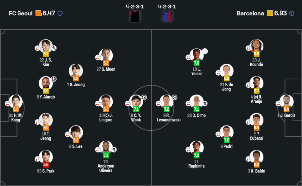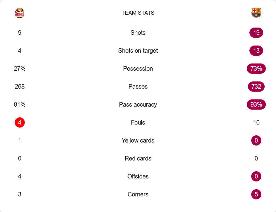 บาร์เซโลน่าครองเกมขาดทุกมิติ ทั้งการครองบอล 73% เทียบกับ 27% ของเจ้าบ้าน จ่ายบอลสำเร็จ 732 ครั้ง (ความแม่น 93%) ขณะที่ FC Seoul จ่ายเพียง 268 ครั้ง (แม่นยำ 81%) บาร์ซ่ายิงรวม 19 ครั้ง เข้ากรอบถึง 13 ส่วนเจ้าบ้านยิง 9 เข้ากรอบ 4 ฟาวล์ของบาร์ซ่าสูงถึง 10 แต่ไร้ใบเหลือง ส่วนโซลโดนไป 1 ใบในเกมที่เน้นสปีดดุเดือด