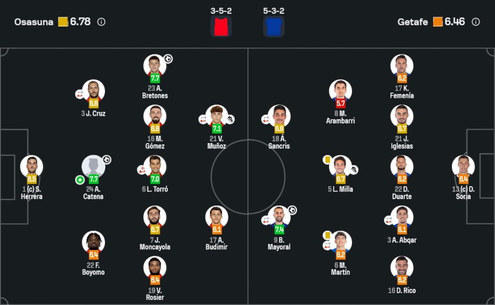 อเลฆานโดร คาเตน่า (Osasuna) กองหลังที่ไม่เพียงคุมเกมรับได้อย่างเหนียวแน่น แต่ยังเติมขึ้นมายิงประตูชัยสุดสำคัญในนาทีสุดท้าย คว้าเรตติ้งสูงสุด 7.7 และเป็นฮีโร่ของเกมนี้