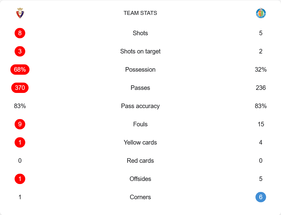 โอซาซูน่าครองบอลเหนือกว่าชัดเจนที่ 68% เทียบกับเกตาเฟ่ที่มีเพียง 32% การผ่านบอลเจ้าบ้านมากถึง 370 ครั้ง ความแม่นยำ 83% ส่วนเกตาเฟ่ผ่านบอล 236 ครั้งเท่ากับ 83% โอกาสยิงโอซาซูน่า 8 ครั้ง เข้ากรอบ 3 ขณะที่เกตาเฟ่ยิงเพียง 5 ครั้ง เข้ากรอบ 2 แต่เกมนี้เกตาเฟ่เล่นหนักฟาวล์ถึง 15 ครั้ง โดนใบเหลือง 4 ใบ ขณะที่โอซาซูน่าเสียฟาวล์ 9 ครั้ง ได้ใบเหลืองแค่ 1 ใบ