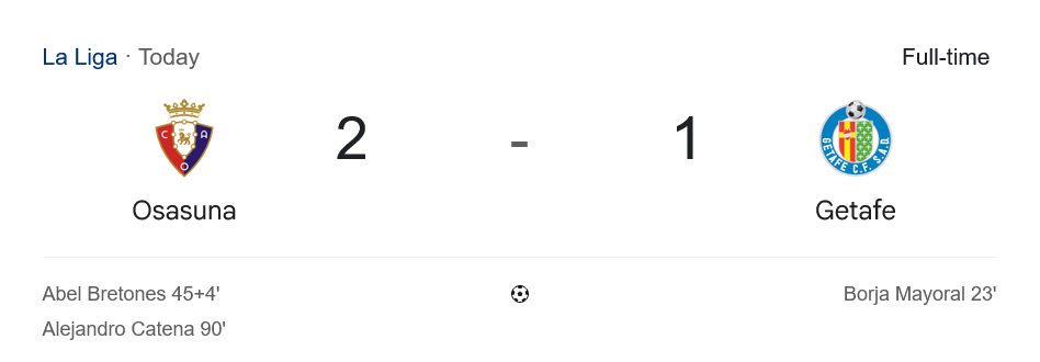 ศึก ลาลีกา สเปน เต็มไปด้วยดราม่าอีกครั้ง เมื่อ โอซาซูน่า เปิดบ้านเฉือนเอาชนะ เกตาเฟ่ ไปแบบสุดระทึก 2-1 จากประตูชัยนาทีสุดท้ายของ อเลฆานโดร คาเตน่า ส่งผลให้แฟนบอลเจ้าถิ่นได้เฮลั่นสนาม ส่วนผลนี้ถือเป็น ผลบอลสด ที่ทำให้เกตาเฟ่พลาดโอกาสขยับขึ้นไปเกาะกลุ่มหัวตาราง
