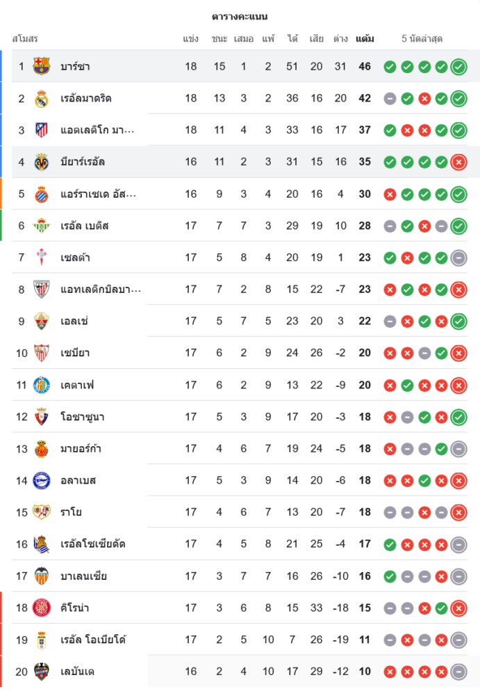 ด้าน บียาร์เรอัล แม้จะแพ้ในบ้านแต่ยังรั้งอันดับ 4 มี 35 คะแนนจาก 16 นัด เสียเปรียบตรงที่ฟอร์มสะดุดและเพิ่งแพ้ในเกมล่าสุด ทำให้ถูกจ่าฝูงทิ้งห่างไปไกล อย่างไรก็ตาม ด้วยจำนวนแข่งน้อยกว่าสองทีมเมืองมาดริด พวกเขายังมีโอกาสกลับมากดดันในพื้นที่ท็อปโฟร์ ถ้าเก็บชัยในเกมตกค้างได้
