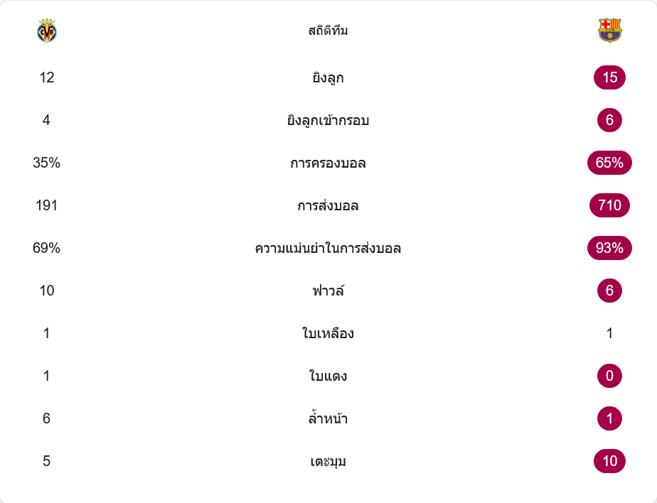 โอกาสยิงรวมบาร์ซ่ายิงมากกว่า โดยซัด 15 ครั้ง เข้ากรอบ 6 ส่วนเจ้าถิ่นได้ยิง 12 ครั้ง เข้ากรอบแค่ 4 นั่นอธิบายว่าทำไมมือกาวอย่างโฮอัน การ์เซียจึงไม่ได้เจองานหนักชนิดถล่มประตู แต่ทุกจังหวะที่มาถึงก็ถูกจัดการอย่างมั่นใจ เกมฟาวล์เอง บียาร์เรอัลทำถึง 10 ครั้งมากกว่าบาร์ซ่า (6 ครั้ง) แถมมีใบเหลือง 1 และใบแดง 1 ต่างจากทีมเยือนที่โดนเหลืองแค่ใบเดียวทั้งเกม ด้านลูกเตะมุมก็สะท้อนความกดดันต่อเนื่องของบาร์ซ่า เมื่อทีมเยือนเหนือกว่าชัดเจนที่ 10 ลูกต่อ 5 ลูก