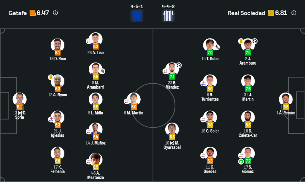 แม้คนทำประตูชัยจะเป็นอารามบูรู แต่รางวัล Man of the Match ตกเป็นของ เซร์คิโอ โกเมซ แบ็กซ้ายของเรอัล โซเซียดัด ด้วยเรตติ้ง 7.7 เขาแทบจะครอบครองฝั่งซ้ายเอาไว้คนเดียว ทั้งการเติมเกมริมเส้น เปิดบอลเข้าเขตโทษหลายครั้ง ทำให้แนวรับเกตาเฟ่ต้องถอยลึกตามตลอด