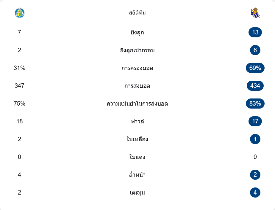 ตัวเลขหลังเกมสะท้อนภาพชัดเจนว่าโซเซียดัดคุมเกมเหนือกว่า เกตาเฟ่ยิงรวมเพียง 7 ครั้ง เข้ากรอบ 2 ครั้ง ขณะที่ทีมเยือนกดไปถึง 13 ครั้ง เข้ากรอบ 6 ครั้ง การครองบอลก็แตกต่างกันชัด เจ้าถิ่นถือบอลแค่ 31% ส่วนโซเซียดัดครองบอลถึง 69% ต่อบอลกันถึง 434 ครั้ง ด้วยความแม่นยำ 83% ขณะที่เกตาเฟ่จ่ายบอลได้ 347 ครั้ง ความแม่นยำ 75%