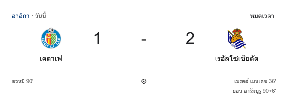 ลาลีกา เกมที่โคลีเซียม อัลฟอนโซ เปเรซ แฟนเจ้าถิ่นเกตาเฟ่ต้องนั่งกุมขมับกันทั้งสนาม เมื่อทีมรักโดนเรอัล โซเซียดัดบุกมายัดเยียดความพ่ายแพ้แบบเจ็บลึก 1-2 จากประตูชัยในช่วงทดเจ็บของ จอน อารามบูรู ทำให้คนที่เปิดเช็ก ผลบอลสด อยู่ต้องร้องอุทานกับสกอร์ที่พลิกไปพลิกมานาทีสุดท้าย