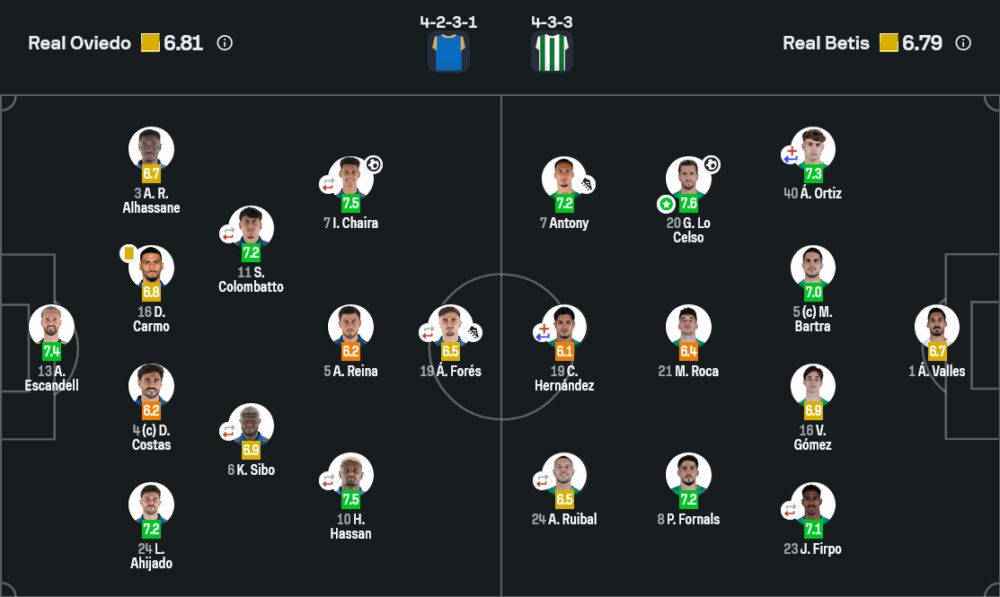 บ้านกีฬาให้เครดิตเต็ม ๆ กับ โจวานนี โล เซลโซ่ มิดฟิลด์อาร์เจนไตน์ที่เป็นทุกอย่างให้เบติสในค่ำคืนนี้ ทั้งการเชื่อมเกมระหว่างกลางกับหน้าสาม การหาพื้นที่ระหว่างไลน์รับของโอเบียโด้ รวมถึงการจ่ายบอลคิลเลอร์พาสหลายครั้ง คะแนน 7.6 จากระบบสถิติไม่เกินจริงเลย ไฮไลต์หลักคือจังหวะโหม่งตีเสมอนาที 83 ที่เจ้าตัวอ่านจังหวะโฉบขึ้นเหนือแนวรับเจ้าบ้านพอดีเป๊ะ ส่งให้เบติสแบกหนึ่งแต้มกลับบ้าน และรักษาความหวังในเส้นทางพื้นที่ยุโรปเอาไว้