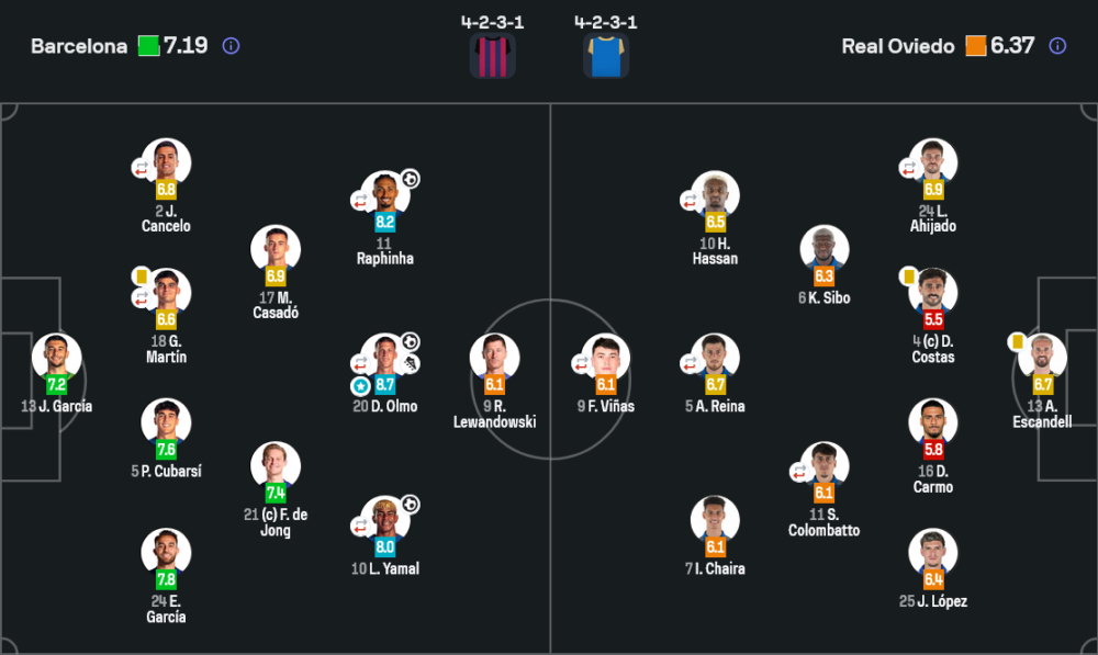 บ้านกีฬาเห็นภาพชัดว่าบาร์ซ่าของฟลิควางแผน 4-2-3-1 แบบเน้นบุกเต็มระบบ คู่กลางใช้ กาซาโด ยืนต่ำช่วย เดอ ยอง คอยออกบอลจากหลังขึ้นหน้า ก่อนให้โอลโม่ยืนเป็นแม่ทัพเบอร์ 10 เชื่อมกับสองปีก ราฟินญ่า–ยามาล ที่ยืนกว้างถ่างแผงรับคู่แข่ง เมื่อทีมครองบอลได้ถึง 73% การต่อบอลสั้นสลับยาวของพวกเขาจึงไหลลื่น แดนกลางโอเบียโด้ไล่ยังไงก็ไม่ทัน