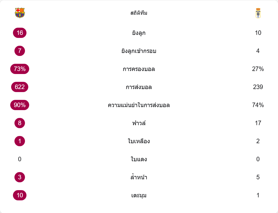 ตัวเลขหลังเกมช่วยยืนยันว่าเจ้าบุญทุ่มเหนือกว่าชัดเจน บาร์ซ่ามียิงทั้งหมด 16 ครั้ง เข้ากรอบ 7 ขณะที่โอเบียโด้มีโอกาส 10 ครั้ง เข้ากรอบ 4 แต่ส่วนใหญ่เป็นลูกยิงไกลที่ดูแลได้ การครองบอลฝั่งเจ้าบ้านสูงลิ่ว 73% ต่อ 27% พร้อมจำนวนการจ่ายบอล 622 ครั้ง และความแม่นยำระดับ 90% แสดงให้เห็นถึงการคอนโทรลเกมแบบเบ็ดเสร็จ