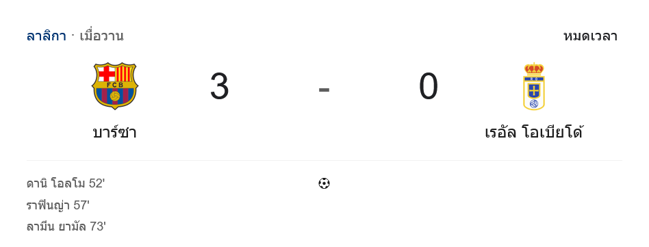 บ้านผลบอล สรุปหลังเกม ลาลีกา สเปน เดือด! โอลโม่กดหนึ่งจ่ายหนึ่ง บาร์ซ่าถล่มโอเบียโด้ 3-0 ตอกย้ำจ่าฝูงหนีชุดขาวต่อ