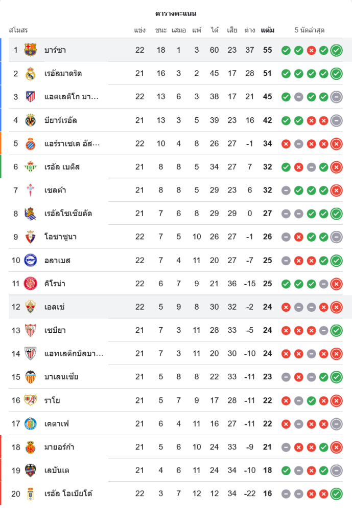 ด้านเอลเช่ แม้จะสู้เต็มที่แต่แพ้คาบ้าน ทำให้สถิติ 22 นัด ชนะ 5 เสมอ 9 แพ้ 8 ประตูได้เสีย 30-32 อยู่กลางตารางอันดับ 12 มี 24 คะแนน ยังไม่ถึงขั้นเสี่ยงตกชั้นแต่ก็ยังต้องทำงานหนักต่อไป เพราะแต้มเหนือโซนล่างไม่ขาดมาก หากหลุดแพ้ต่อเนื่องมีสิทธิลุ้นเหนื่อยยาวได้เหมือนกัน แฟนบอลมองไปที่ ตารางบอล แล้วคงรู้เลยว่าช่วงโปรแกรมต่อจากนี้ไม่ง่าย