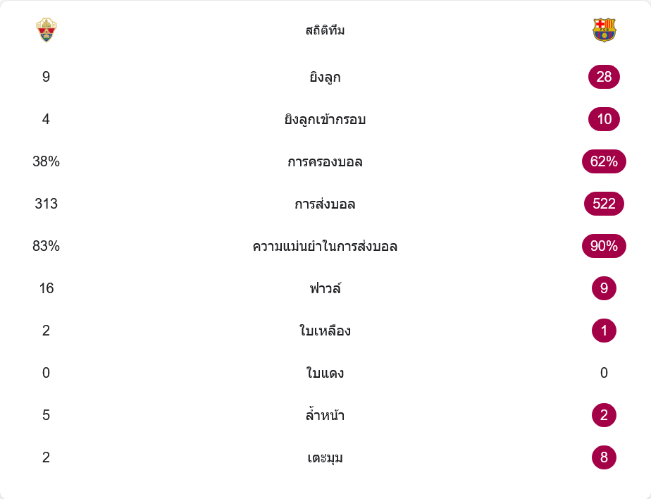 ตัวเลขหลังเกมสะท้อนชัดว่าบาร์ซ่าคุมเกมไว้ในกำมือ ทีมเยือนมีโอกาสยิงถึง 28 ครั้ง เข้ากรอบ 10 ครั้ง ขณะที่เอลเช่ยิงได้เพียง 9 ครั้ง เข้ากรอบ 4 ครั้งเท่านั้น การครองบอลตกเป็นของบาร์ซ่า 62% ต่อ 38% พร้อมกับจำนวนการจ่ายบอล 522 ต่อ 313 และความแม่นยำในการจ่ายสูงถึง 90% แตกต่างกับเจ้าบ้านที่อยู่ราว 83%