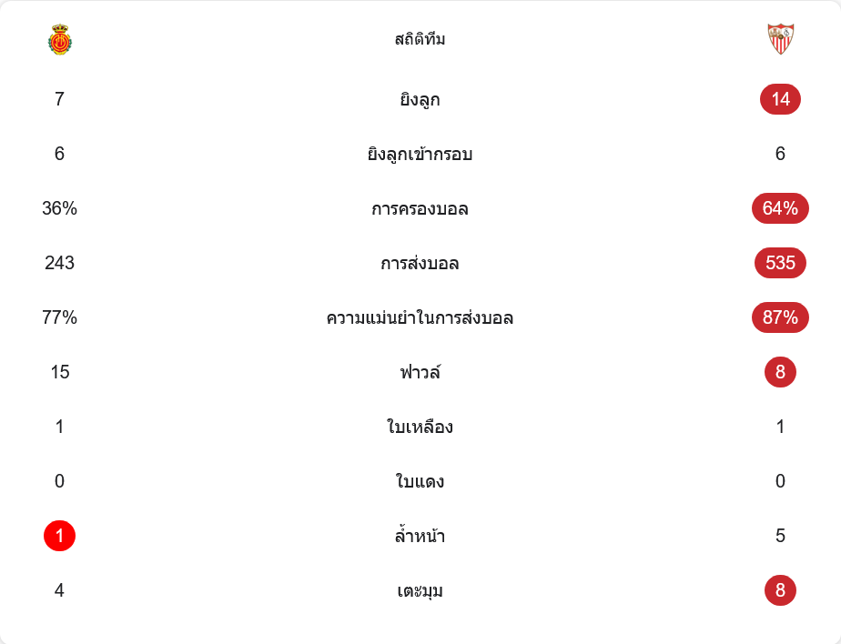 ตัวเลขหลังเกมสะท้อนภาพได้ชัด เซบีย่าครองบอลถึง 64% เหนือกว่ามายอร์ก้าที่มีเพียง 36% ทีมเยือนยิงรวม 14 ครั้ง เข้ากรอบ 6 เท่ากับเจ้าบ้านที่ยิงแค่ 7 ครั้ง แต่ 6 ครั้งนั้นกลายเป็น 4 ประตู หนึ่งในจุดต่างที่สำคัญคือจำนวนการผ่านบอล เซบีย่าจ่ายถึง 535 ครั้ง ด้วยความแม่นยำ 87% ขณะที่มายอร์ก้าจ่ายเพียง 243 ครั้ง แม่นยำ 77% แสดงให้เห็นว่าเจ้าบ้านเล่นบอลน้อยแต่เน้นประสิทธิภาพมากกว่า