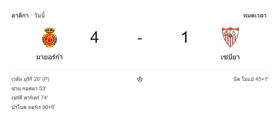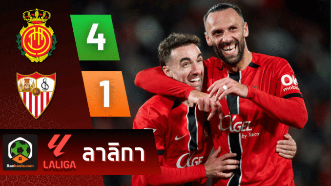 บ้านผลบอล สรุปหลังเกม ลาลีกา เดือดคาบเกาะ! มูริกี–ซามู กอสตา กดเครื่อง พามายอร์ก้าถล่มเซบีย่า 4-1 ขยับหนีโซนลุ้นตกชั้น