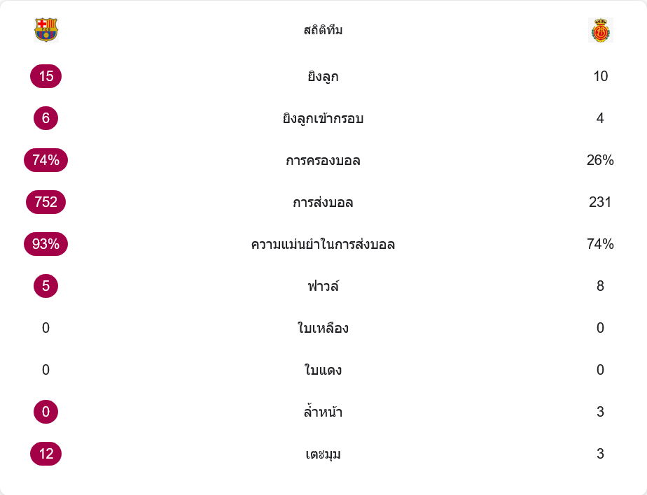 จำนวนการจ่ายบอลของบาร์เซโลน่าแตะที่ 752 ครั้ง ด้วยความแม่นยำสูงถึง 93% ขณะที่มายอร์ก้าจ่ายได้เพียง 231 ครั้ง ความแม่นยำ 74% เท่านั้น สะท้อนความแตกต่างทั้งคุณภาพและความนิ่งในการเล่น ลูกฟาวล์บาร์ซ่าทำไป 5 ครั้ง แต่มายอร์ก้า 8 ครั้ง เสริมภาพว่าทีมเยือนจำเป็นต้องตัดฟาวล์เพื่อหยุดเกมสวนกลับของเจ้าบ้าน ยังดีที่ทั้งสองทีมไม่มีใบเหลืองใบแดงให้ปวดหัว
