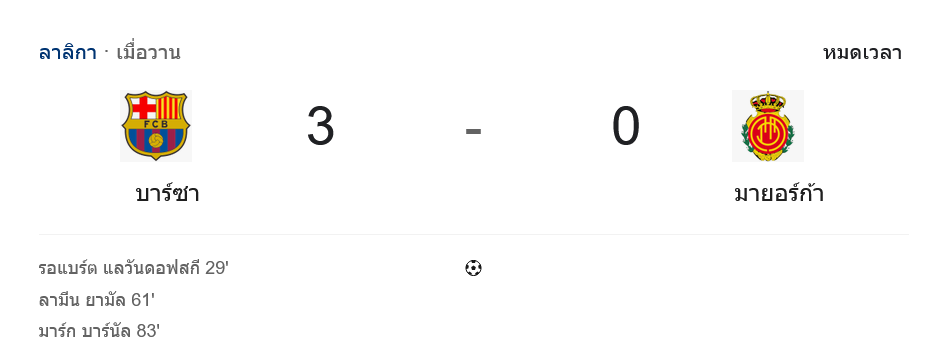 ช่วงทดเวลา มายอร์ก้ามีโอกาสลุ้นสองจังหวะติดกันแต่ยิงไม่ตรงกรอบทั้งหมด ทำให้จบเกม บาร์เซโลน่าคว้าชัยด้วยสกอร์ขาดลอย 3-0 พร้อมเก็บคลีนชีตได้อย่างน่าประทับใจ